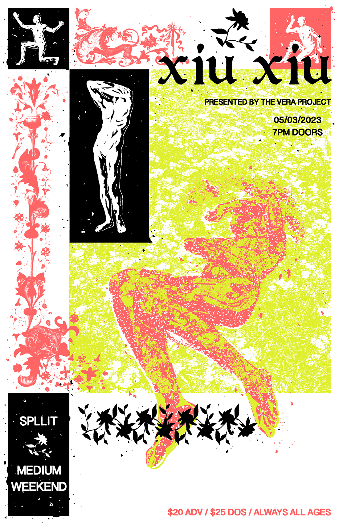 Poster designed and screen printed for The Vera Project, presenting Xiu Xiu, Spllit, and Medium Weekend. 3-color screen print.
